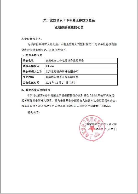 關(guān)于寬投瑞安1號私募證券投資基金基金業(yè)績報酬變更的公告