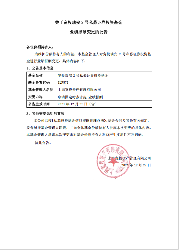 關于寬投瑞安2號私募證券投資基金基金業(yè)績報酬變更的公告