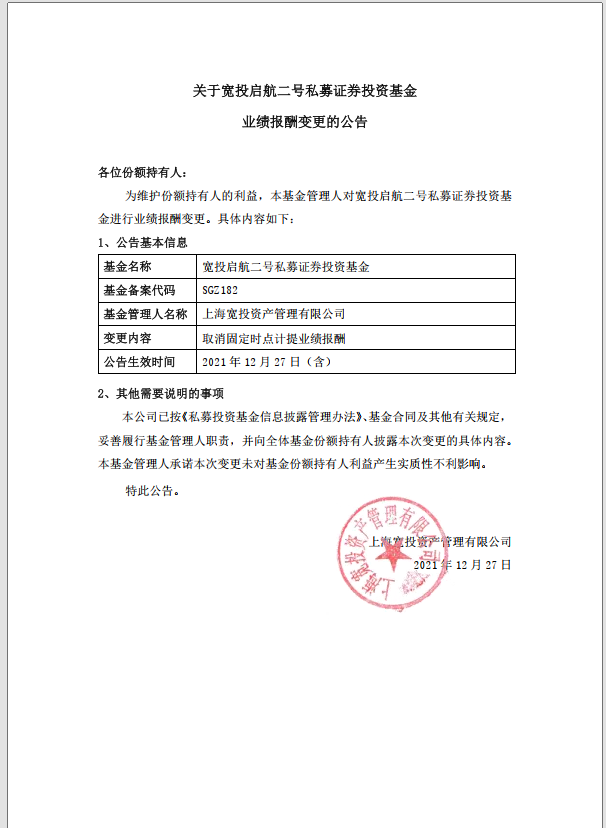 關(guān)于寬投啟航二號(hào)私募證券投資基金基金業(yè)績(jī)報(bào)酬變更的公告