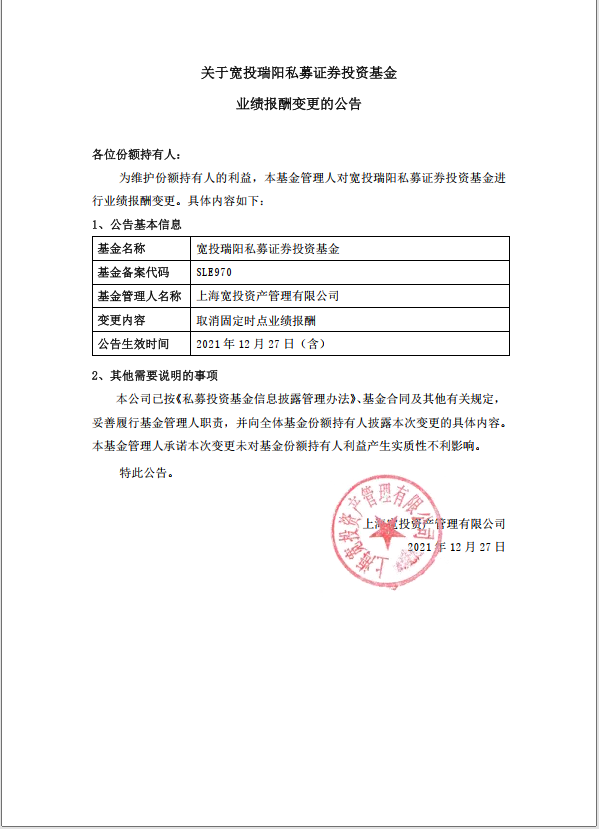 關(guān)于寬投瑞陽私募證券投資基金基金業(yè)績報(bào)酬變更的公告